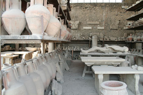 En 1860 la dirección de las excavaciones fue confiada a Giuseppe Fiorelli, que experimentó la sugestiva técnica de los calcos en yeso para revivir la dramática agonía de la ciudad; de hecho los cuerpos de personas y animales y los organismos vegetales (plantas, árboles y también objetos de madera), recubiertos por una gruesa capa de “lapilli” incandescentes, se descompusieron dejando un vacío en el compacto banco de ceniza; colando yeso líquido en estas cavidades, se sacaron unos calcos que reproducían fielmente los rasgos de hombres y animales en los últimos instantes de su vida. En este periodo salieron a la luz la Casa dei Vetti, la Casa degli Amorini dorati, la Casa di Lucrezio Frontone, la Villa dei Misteri y la Casa di Menandro. En los últimos años las excavaciones, confiadas en principio a Amedeo Maiuri y luego a partir de 1961 a de Franciscis , se han ido perfeccionando, llegando a descubrir más o menos tres quintas partes de toda la ciudad.